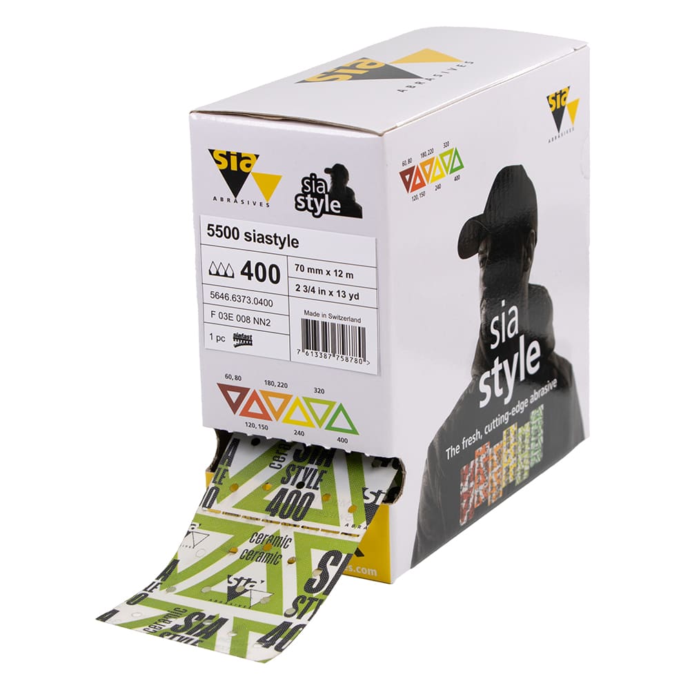 Das neue, farbcodierte Schleifmittel 5500 siastyle überzeugt mit absoluter Prozesssicherheit und frischem Design. Die stabilen Korninseln garantieren höchste Produktivität und einen konstanten Arbeitsprozess. Die robuste Folienunterlage hat eine hohe Reissfestigkeit und hält stärksten Beanspruchungen stand. Für uns, das coolste Schleifmittel.