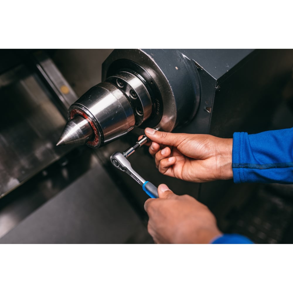 Für handbetätigte Steckschlüsseleinsätze und Verbindungsteile mit Vierkantantrieb nach DIN 3120 - C 6,3, ISO 1174, mit Kugelarretierung, Universeller Einsatz in Industrie und Automotive, auch in beengten Bauräumen, Kleiner, tropfenförmiger Kopf für engste Schraubstellen, Feinverzahnt (40 Zähne), mit Umschalthebel und Druckknopfauslösung