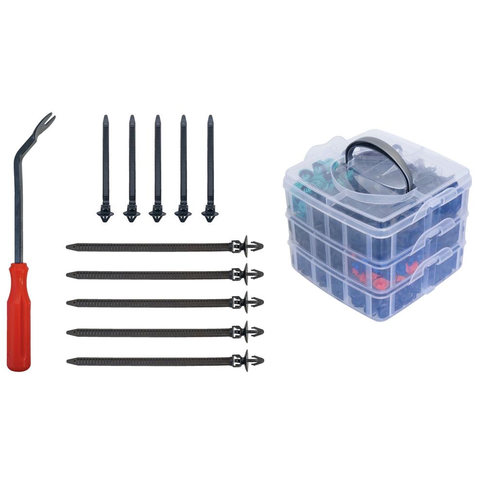 Das Set enthält eine grosse Auswahl an gängigen Befestigungsclips und Spreiznieten, übersichtlich aufbewahrt in einem praktischen Stapelboxsystem.