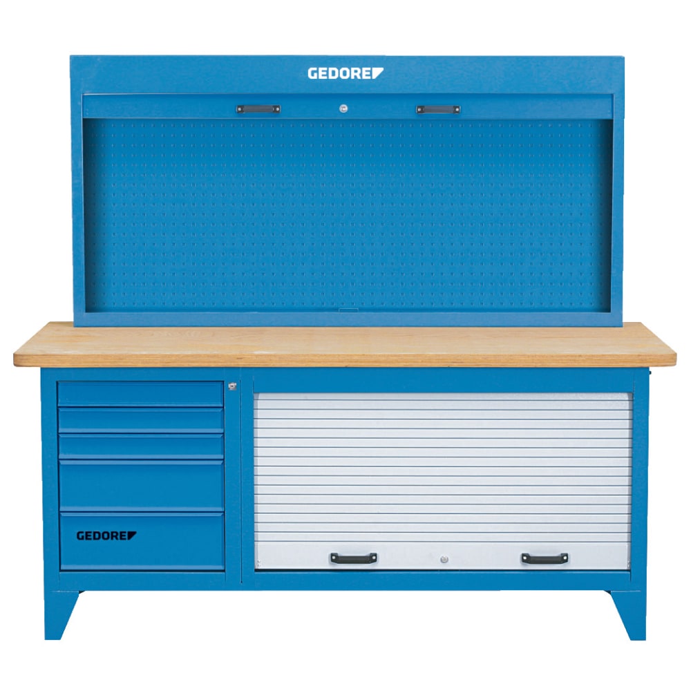 40 mm starke Multiplex Buchen-Schichtholzplatte, Oberfläche durch Leinölfirnis zusätzlich geschützt, Grosser Stauraum mit Jalousie, Rückwand mit Vierkantlochung 10 x 38 mm, Getrennte Zentralverriegelung mit Zylinderschloss für Schubladen und Jalousie, Tragfähigkeit pro Schublade 40 kg, Gesamttragkraft (Werkbank) 2000 kg