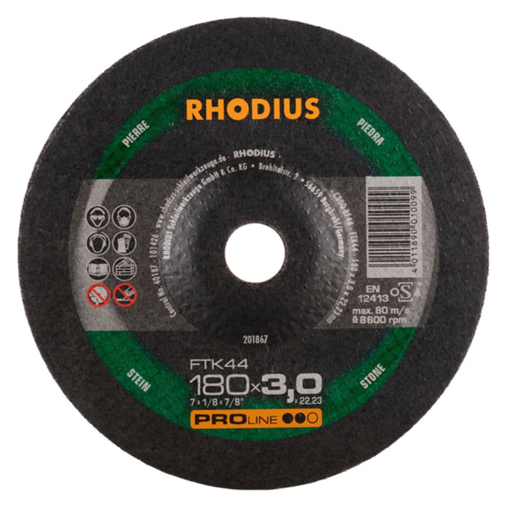 Die Trennscheibe enthält hochwertiges SIC und 2 vollflächige Glasfasergewebe. Die Mindestseitenlast für die Trennscheibe beträgt nach EN 12413 und oSa 40 N, bzw. ab Durchmesser 150 mm 50 N. Im Bohrungsring ist das Verfallsdatum (drei Jahre) eingeprägt. Durch aufwendige In-Prozess-Kontrollen in der Produktion wird eine gleichbleibende Qualität gewährleistet. Um ein Maximum an Sicherheit zu bieten, wird jede tausendste Scheibe zerstörend getestet.