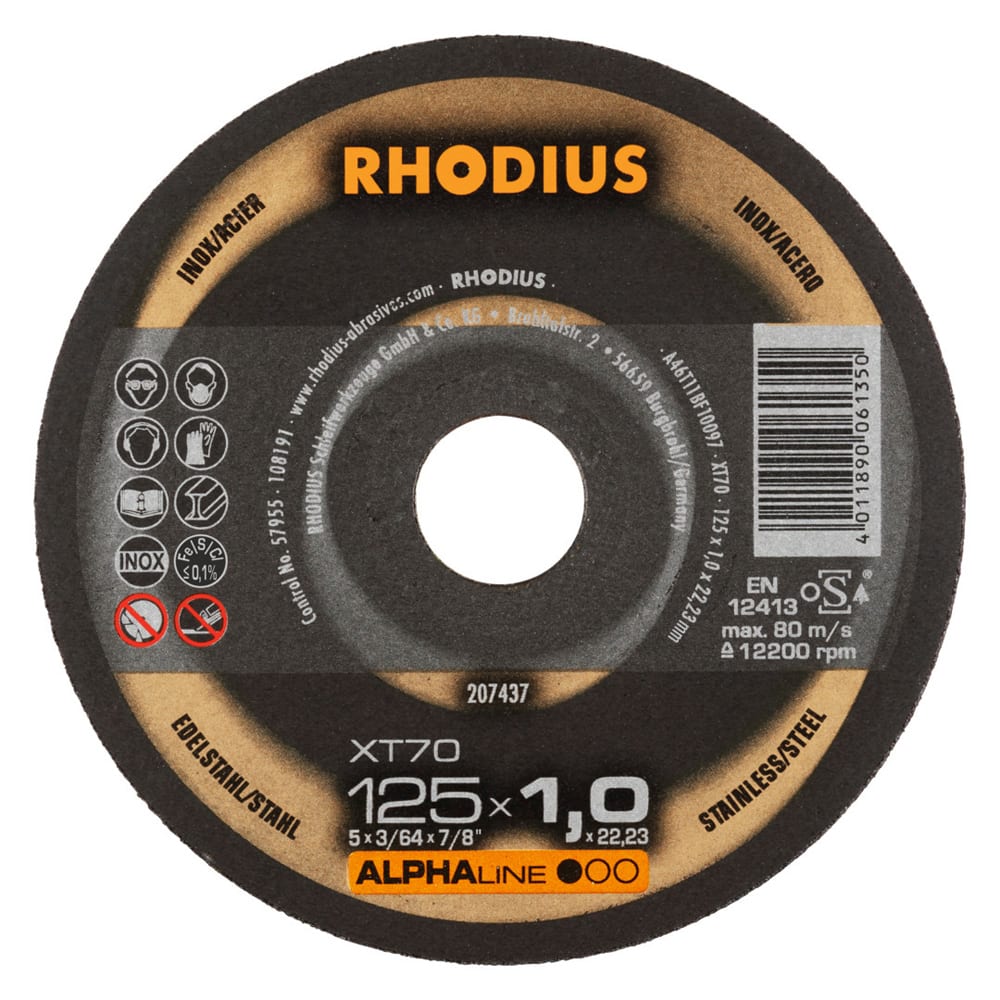 Die Trennscheibe enthält hochwertiges Korund (Aluminiumoxid) und 2 vollflächige Glasfasergewebe. Die Mindestseitenlast für die Trennscheibe beträgt nach EN 12413 und oSa 40 N, bzw. ab Durchmesser 150 mm 50 N. Im Bohrungsring ist das Verfallsdatum (drei Jahre) eingeprägt. Durch aufwendige In-Prozess-Kontrollen in der Produktion wird eine gleichbleibende Qualität gewährleistet. Um ein Maximum an Sicherheit zu bieten, wird jede tausendste Scheibe zerstörend getestet.