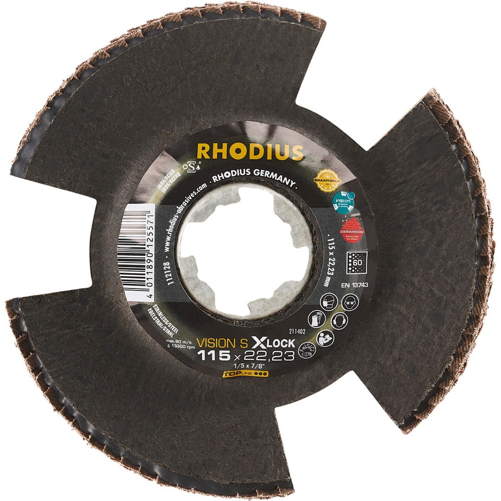 Bei der VISION SPEED X-LOCK wird als Schleifkorn ein hochwertiges Keramikkorn (Sinterkorund) verwendet. Dieses ist selbstschärfend. Alle RHODIUS-Lamellenscheiben sind zudem eisen- und schwefelfrei.