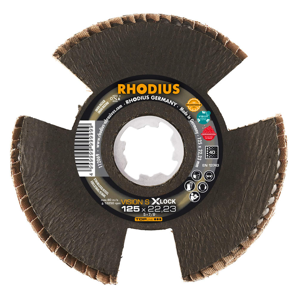 Bei der VISION SPEED X-LOCK wird als Schleifkorn ein hochwertiges Keramikkorn (Sinterkorund) verwendet. Dieses ist selbstschärfend. Alle RHODIUS-Lamellenscheiben sind zudem eisen- und schwefelfrei.