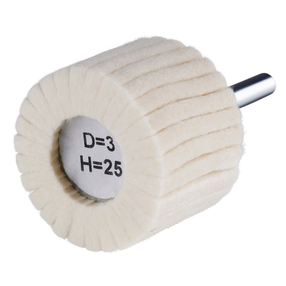 Dieser Filzlamellenpolierer ist in den Durchmessern 40 mm, 60 mm und 80 mm und mit Lamellendicken von 2 mm, 3 mm und 5 mm erhältlich. Der Anwender kann zudem zwischen den Filzhärten H25 und H40 wählen.