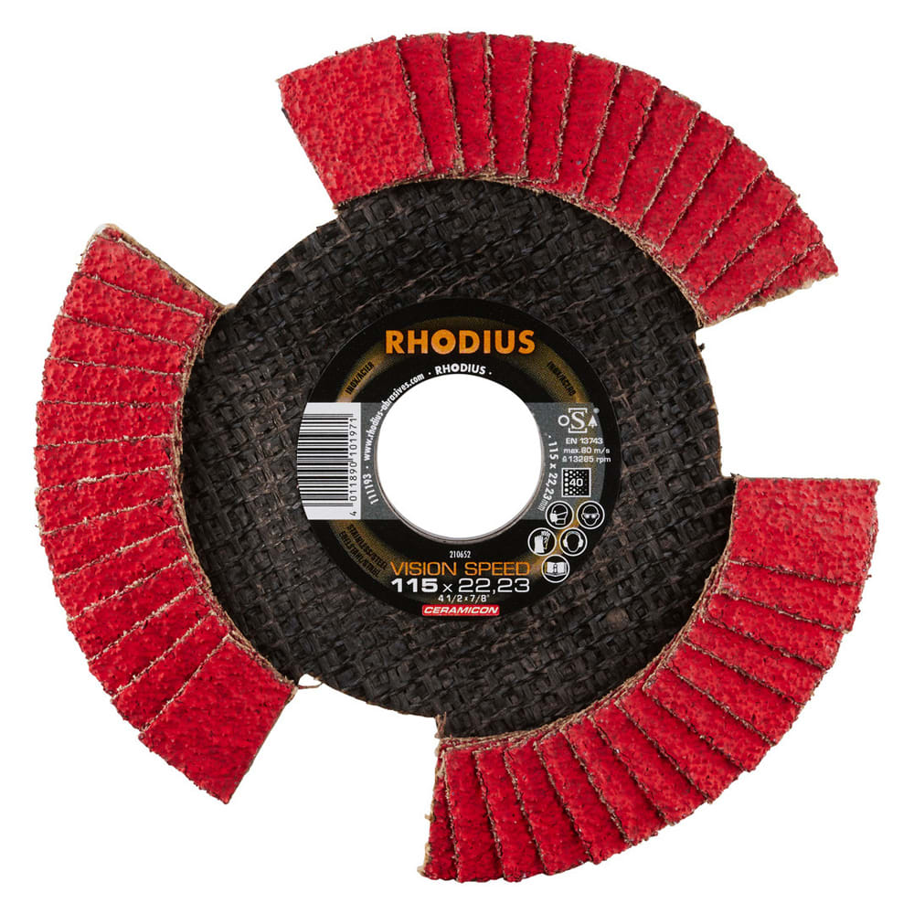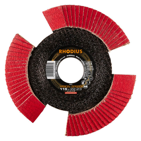 Bei der VISION SPEED wird als Schleifkorn ein hochwertiges Keramikkorn (Sinterkorund) verwendet. Dieses ist selbstschärfend. Alle RHODIUS-Lamellenscheiben sind zudem eisen- und schwefelfrei.