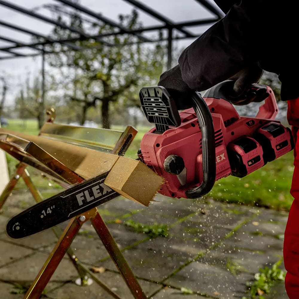 - Puissante tronçonneuse sans fil 2 x 18V avec un guide-chaîne de 35 cm pour des coupes rapides, par ex. pour l’ébranchage et dans des bois jusqu’à 30 cm env.