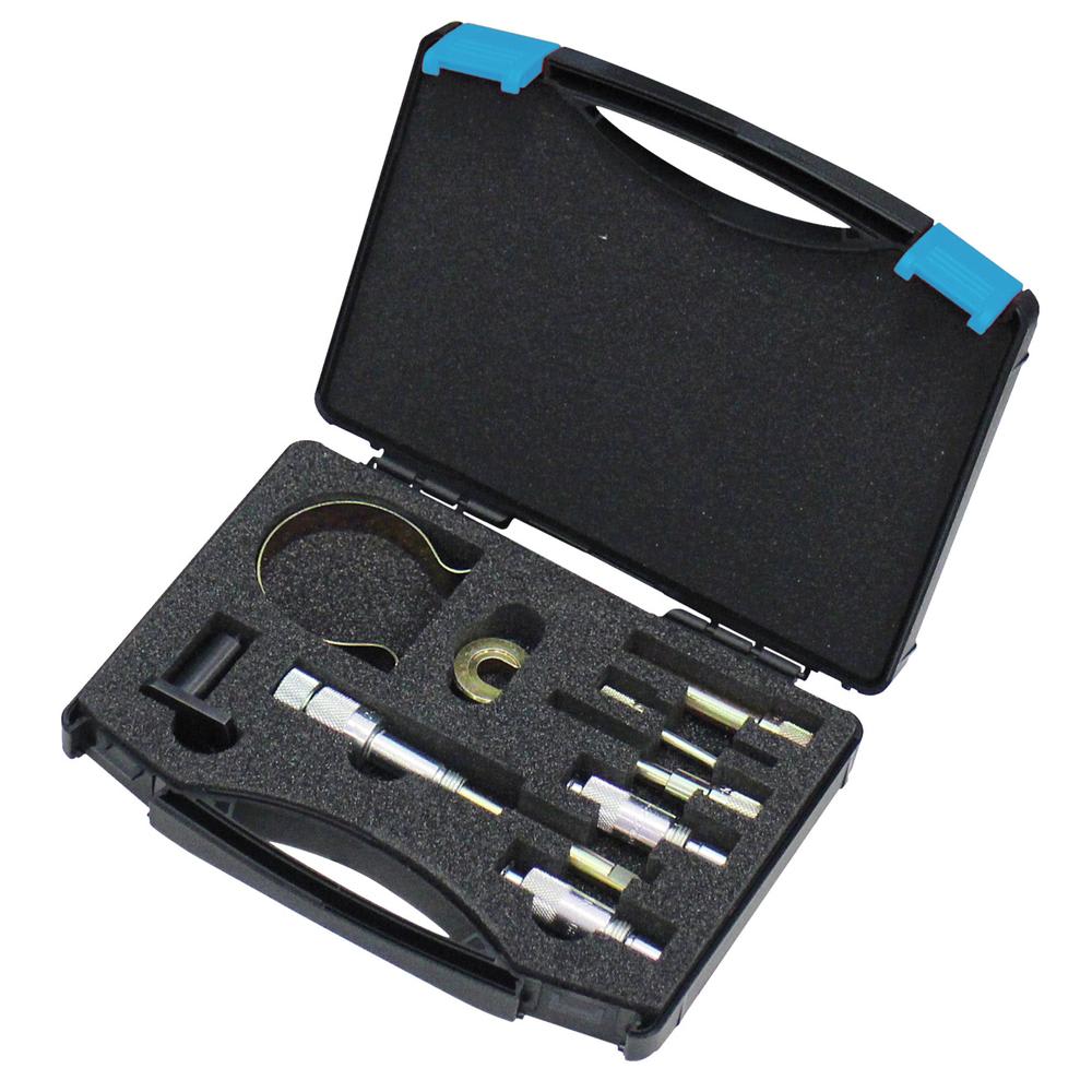 Pour bloquer ou positionner l'arbre de la pompe d'injection, les arbres à cames, le vilebrequin et pour bloquer le dispositif de tension de la courroie de distribution ainsi que pour fixer la courroie de distribution lors de sa pose.