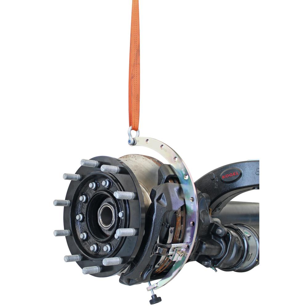 La potence de levage d'étrier de frein permet, à l'aide d'une grue d'atelier, de lever facilement et en ménageant le dos, ainsi que de positionner avec précision les étriers de frein lourds sur les essieux des véhicules utilitaires, des remorques et des semi-remorques, sans l'aide d'une deuxième personne.