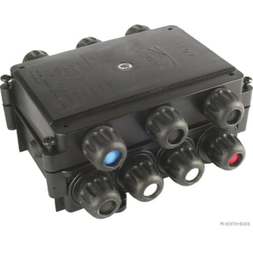 Boîte pour liaison en câbles Aspöck avec raccords vissés 14 PG à bouchons d’étanchéité colorés pour différents diamètres de câble : • 6 x noir (5–6mm) • 1 x marron (2 x 5–6 mm) • 4 x blanc (7–8 mm) • 1 x bleu (9–10 mm) • 2 x rouge (11–13 mm)