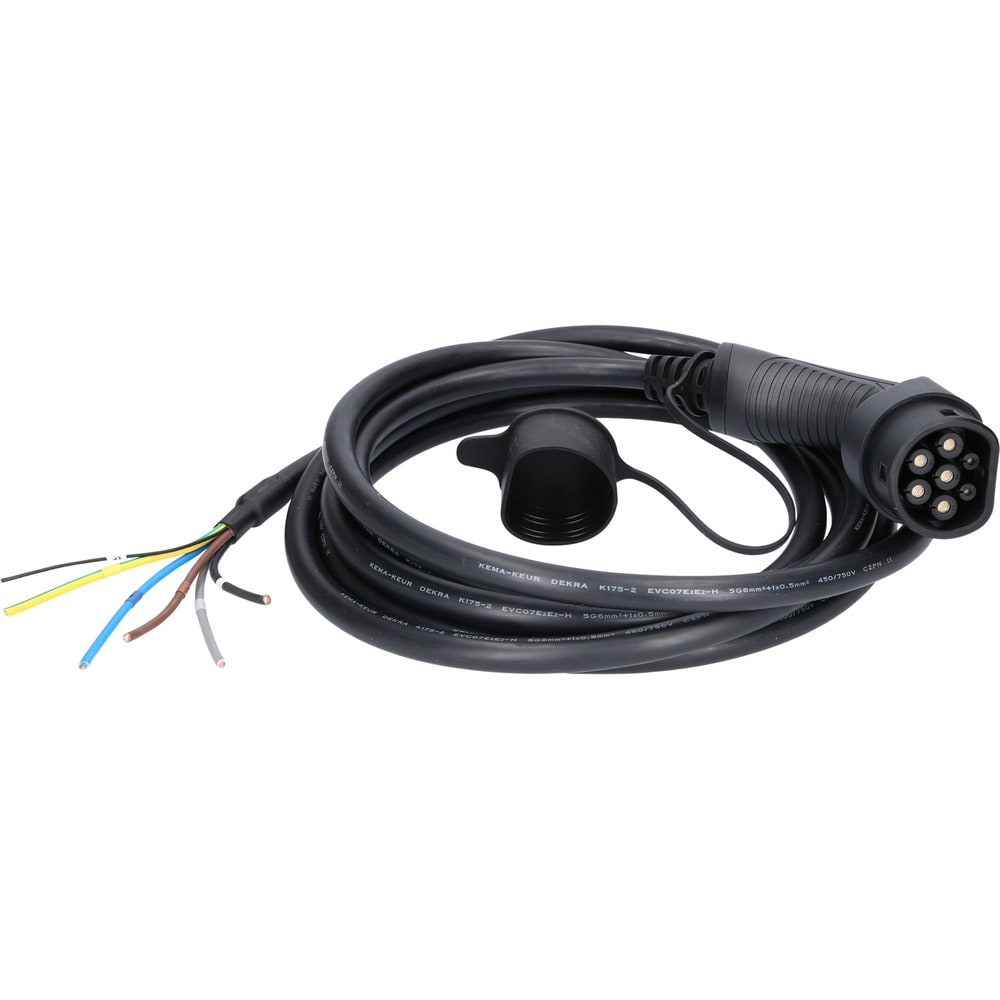 | Modèle efuturo | Câble de charge efuturo droit, connecteur à extrémité ouverte vers le type 2 pour le raccordement à une borne, triphase, jusqu’à 22 kW, 32 A, 400 V, mode 3, 5 mètres |