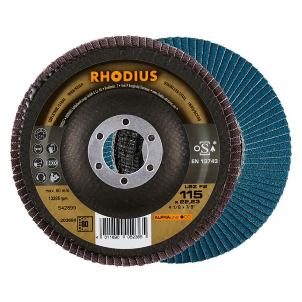 Ce disque a été conçu conformément à la norme EN 13743, satisfait aux exigences de sécurité et est homologué par l’oSA. Il est doté d’un plateau support en fibres de verre. Son utilisateur peut travailler en exerçant de fortes pressions sur sa machine. Le LSZ F2 utilise du zirconium de qualité comme grain abrasif. Tous les disques à lamelles RHODIUS ne contiennent en outre ni fer, ni soufre. Les lamelles sont placées de manière conique sur ce disque. Le positionnement conique des lamelles à 10° améliore l’ergonomie pendant le meulage et facilite ainsi la manipulation.