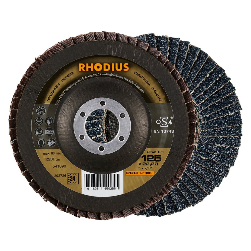 Ce disque a été conçu conformément à la norme EN 13743, satisfait aux exigences de sécurité et est homologué par l’oSA. Il est doté d’un plateau support en fibres de verre. Son utilisateur peut travailler en exerçant de fortes pressions sur sa machine. Le LSZ F1 utilise du zirconium de qualité comme grain abrasif. Tous les disques à lamelles RHODIUS ne contiennent en outre ni fer, ni soufre. Les lamelles sont placées de manière conique sur ce disque. Le positionnement conique des lamelles à 10° améliore l’ergonomie pendant le meulage et facilite ainsi la manipulation.