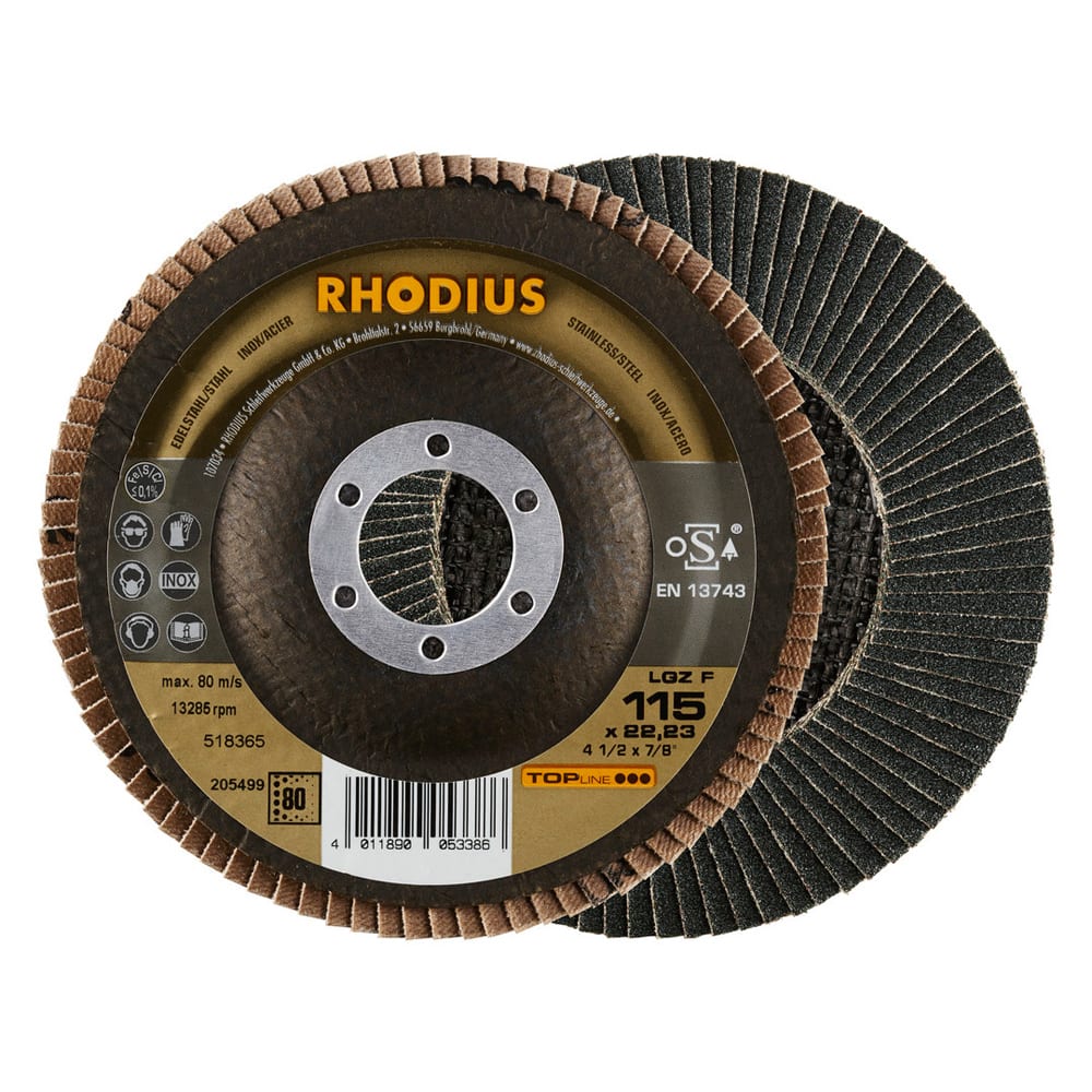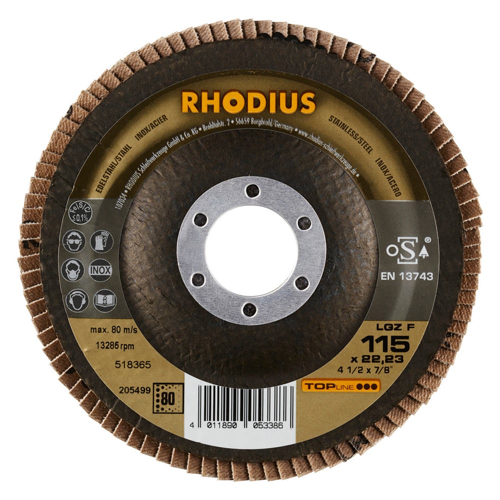 Ce disque a été conçu conformément à la norme EN 13743, satisfait aux exigences de sécurité et est homologué par l’oSA. Il est doté d’un plateau support en fibres de verre. Son utilisateur peut travailler en exerçant de fortes pressions sur sa machine. Le LGZ F utilise du zirconium de qualité comme grain abrasif. Tous les disques à lamelles RHODIUS ne contiennent en outre ni fer, ni soufre. Les lamelles de ce disque sont plates. Lorsqu'un meulage plan est requis, cet agencement plat des lamelles facilite tout particulièrement le travail.