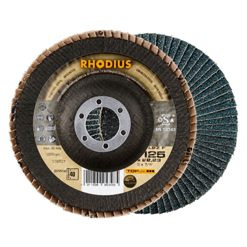 Ce disque a été conçu conformément à la norme EN 13743, satisfait aux exigences de sécurité et est homologué par l’oSA. Il est doté d’un plateau support en fibres de verre. Son utilisateur peut travailler en exerçant de fortes pressions sur sa machine. Le LSZ F EXTENDED utilise du zirconium de qualité comme grain abrasif. Celui-ci est auto-affûtant. Tous les disques à lamelles RHODIUS ne contiennent en outre ni fer, ni soufre. Les lamelles sont placées de manière conique sur ce disque. Le positionnement conique des lamelles à 10° améliore l’ergonomie pendant le meulage et facilite ainsi la manipulation.