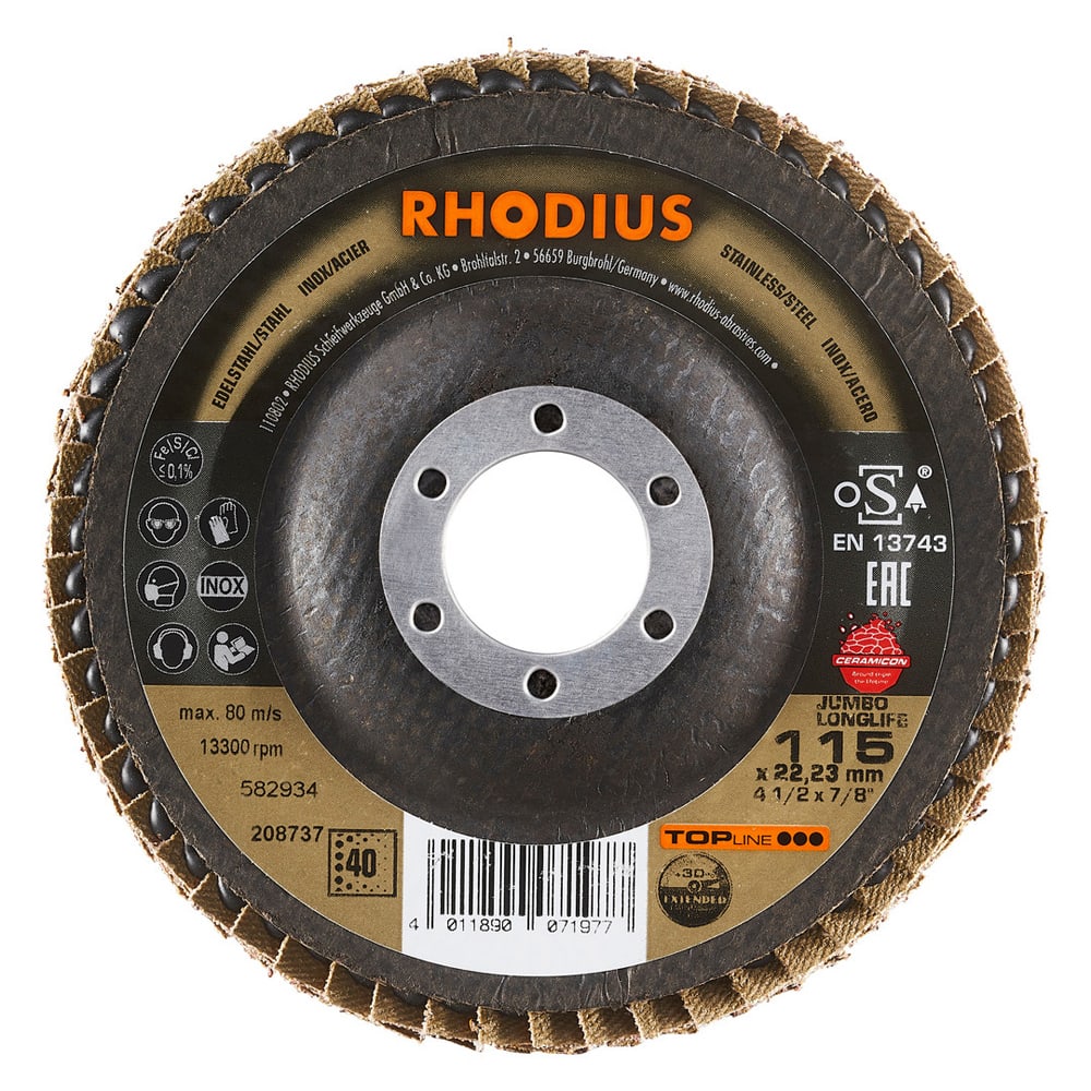 Ce disque a été conçu conformément à la norme EN 13743, satisfait aux exigences de sécurité et est homologué par l’oSA. Il est doté d’un plateau support en fibres de verre. Son utilisateur peut travailler en exerçant de fortes pressions sur sa machine. Le JUMBO LONGLIFE EXTENDED utilise un grain céramique de qualité (corindon fritté) avec du zirconium comme grain abrasif. Tous les disques à lamelles RHODIUS ne contiennent en outre ni fer, ni soufre. Les lamelles sont placées de manière conique sur ce disque. Le positionnement conique des lamelles à 10° améliore l’ergonomie pendant le meulage et facilite ainsi la manipulation.
