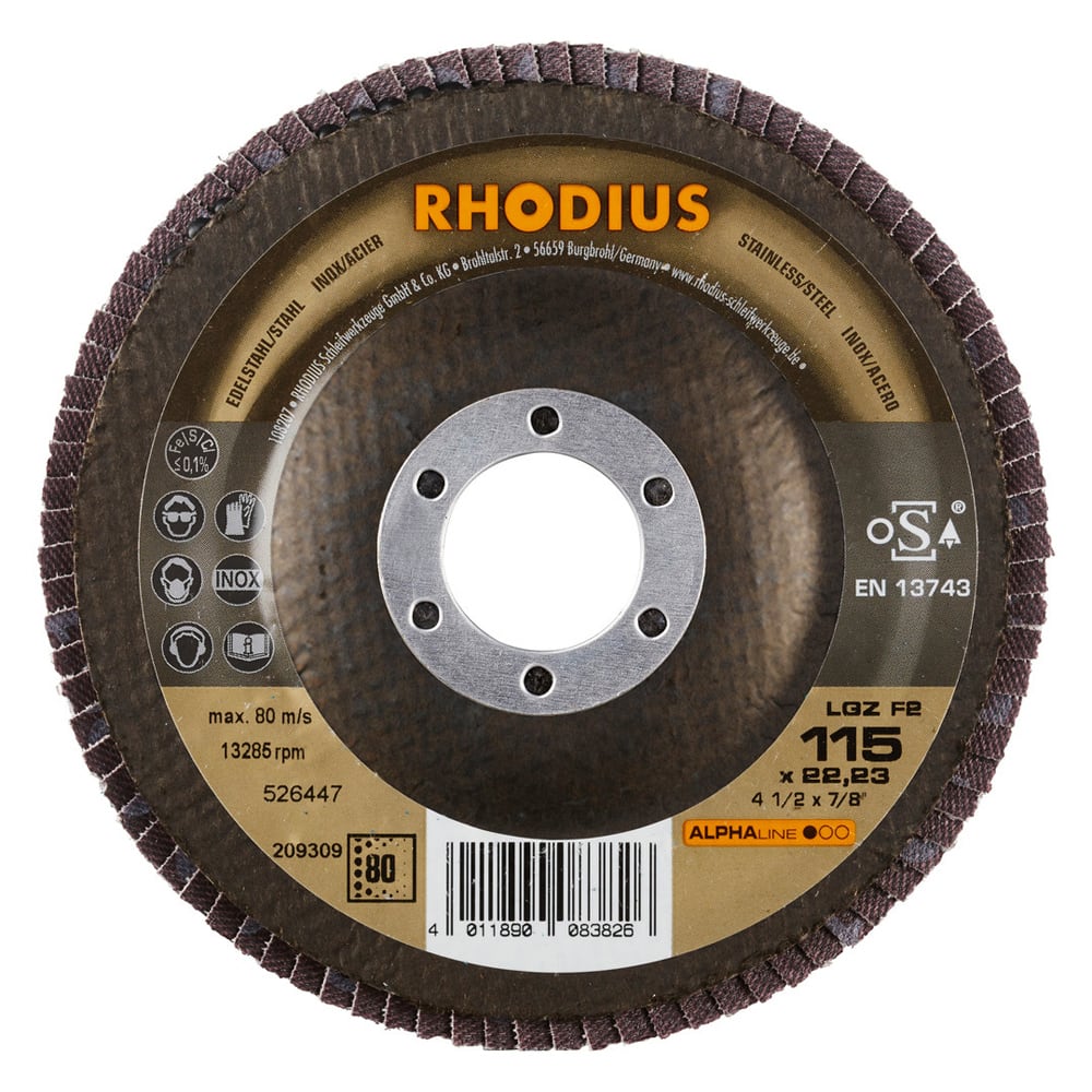 Ce disque a été conçu conformément à la norme EN 13743, satisfait aux exigences de sécurité et est homologué par l’oSA. Il est doté d’un plateau support en fibres de verre. Son utilisateur peut travailler en exerçant de fortes pressions sur sa machine. Le LGZ F2 utilise du zirconium de qualité comme grain abrasif. Tous les disques à lamelles RHODIUS ne contiennent en outre ni fer, ni soufre. Les lamelles de ce disque sont plates. Lorsqu'un meulage plan est requis, cet agencement plat des lamelles facilite tout particulièrement le travail.