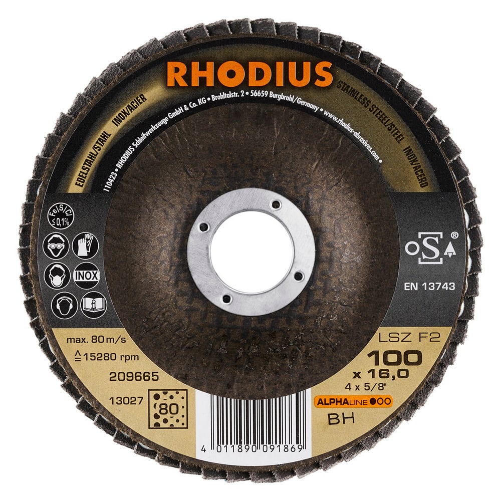 Ce disque a été conçu conformément à la norme EN 13743, satisfait aux exigences de sécurité et est homologué par l’oSA. Il est doté d’un plateau support en fibres de verre. Son utilisateur peut travailler en exerçant de fortes pressions sur sa machine. Le LSZ F2 utilise du zirconium de qualité comme grain abrasif. Tous les disques à lamelles RHODIUS ne contiennent en outre ni fer, ni soufre. Les lamelles sont placées de manière conique sur ce disque. Le positionnement conique des lamelles à 10° améliore l’ergonomie pendant le meulage et facilite ainsi la manipulation.