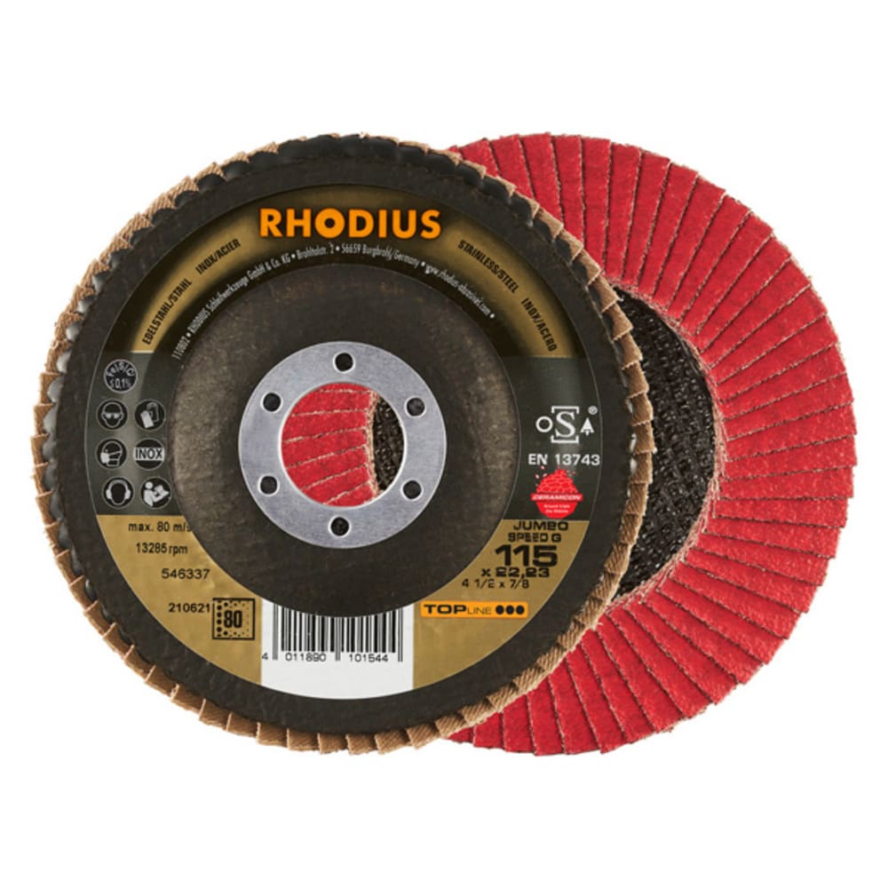 Ce disque a été conçu conformément à la norme EN 13743, satisfait aux exigences de sécurité et est homologué par l’oSA. Il est doté d’un plateau support en fibres de verre. Son utilisateur peut travailler en exerçant de fortes pressions sur sa machine. Le JUMBO SPEED G utilise un grain céramique de qualité (corindon fritté) comme grain abrasif. Celui-ci est auto-affûtant. Tous les disques à lamelles RHODIUS ne contiennent en outre ni fer, ni soufre. Les lamelles de ce disque sont plates. Lorsqu'un meulage plan est requis, l’agencement plat des lamelles facilite tout particulièrement le travail.