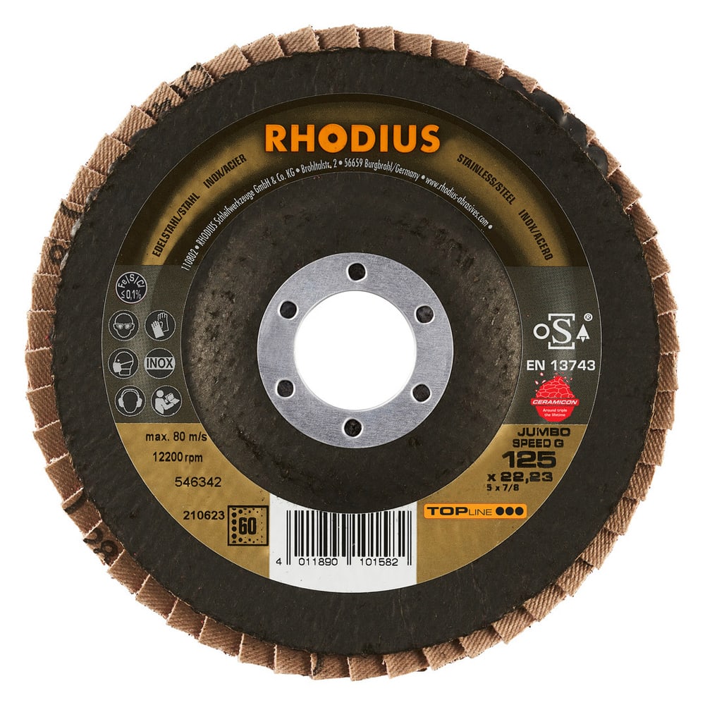 Ce disque a été conçu conformément à la norme EN 13743, satisfait aux exigences de sécurité et est homologué par l’oSA. Il est doté d’un plateau support en fibres de verre. Son utilisateur peut travailler en exerçant de fortes pressions sur sa machine. Le JUMBO SPEED G utilise un grain céramique de qualité (corindon fritté) comme grain abrasif. Celui-ci est auto-affûtant. Tous les disques à lamelles RHODIUS ne contiennent en outre ni fer, ni soufre. Les lamelles de ce disque sont plates. Lorsqu'un meulage plan est requis, l’agencement plat des lamelles facilite tout particulièrement le travail.