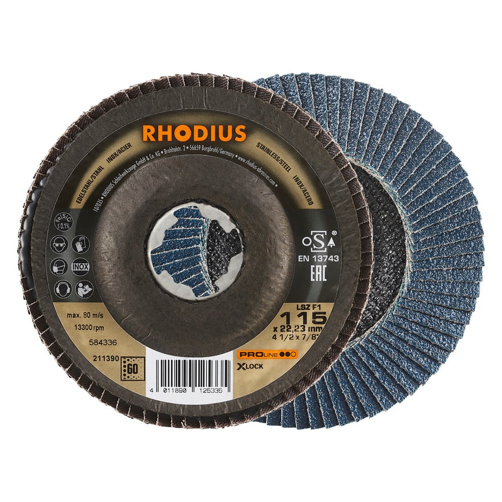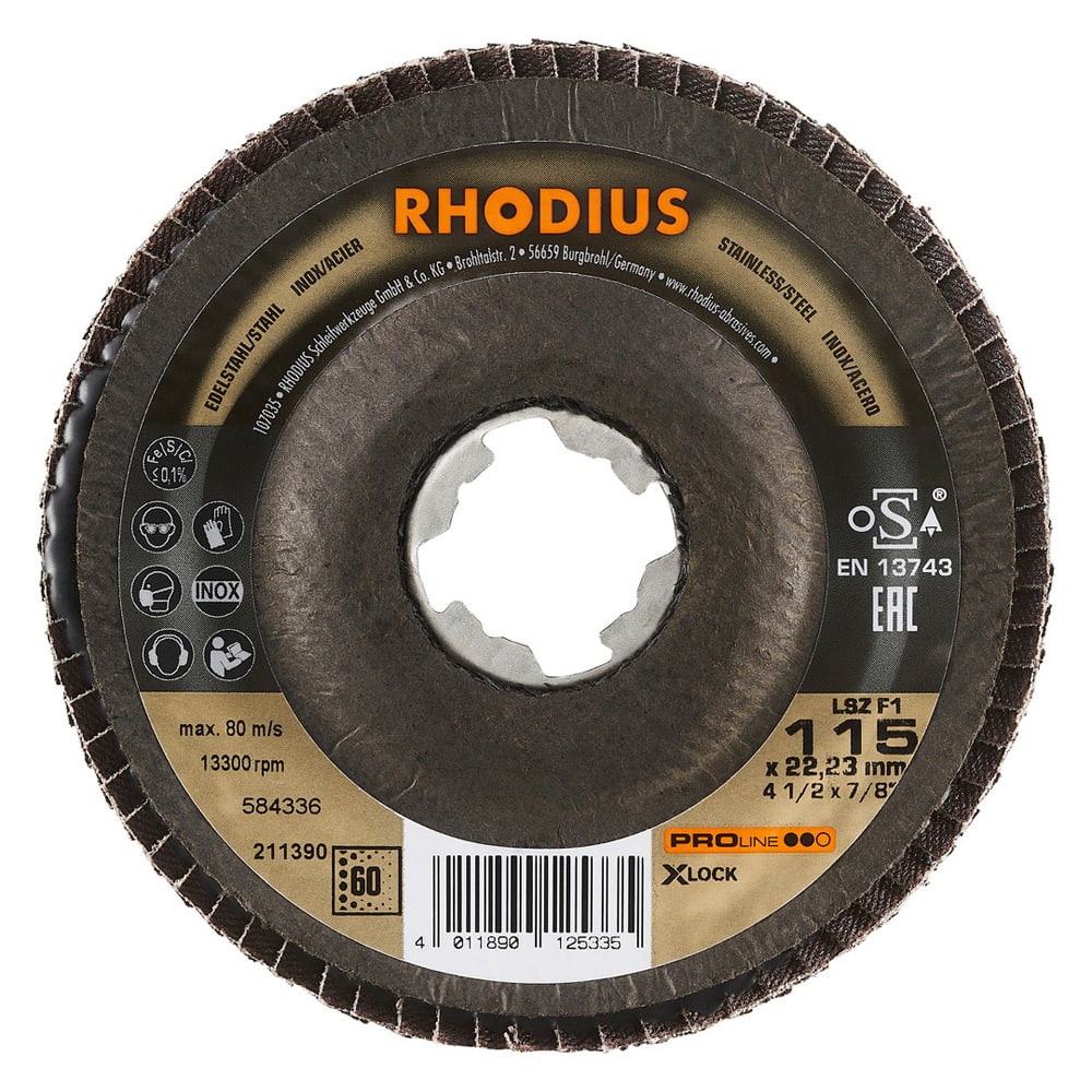 Ce disque a été conçu conformément à la norme EN 13743, satisfait aux exigences de sécurité et est homologué par l’oSA. Le plateau support est fabriqué en tissu en fibres de verre. Son utilisateur peut travailler en exerçant de fortes pressions sur sa machine. Le LSZ F1 X-LOCK utilise du zirconium de qualité comme grain abrasif. Tous les disques à lamelles RHODIUS ne contiennent en outre ni fer, ni soufre. Les lamelles sont placées de manière conique sur ce disque. Le positionnement conique des lamelles à 10° améliore l’ergonomie pendant le meulage et facilite ainsi la manipulation.