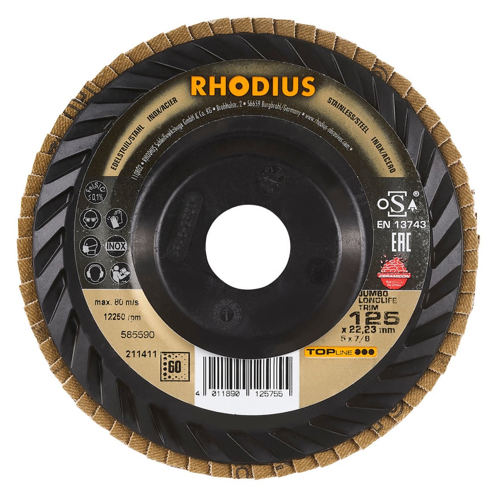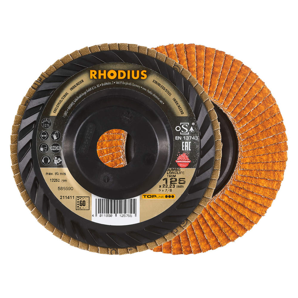 Ce disque a été conçu conformément à la norme EN 13743, satisfait aux exigences de sécurité et est homologué par l’oSA. Le plateau support spécial est fabriqué en ABS. Le JUMBO LONGLIFE TRIM utilise un grain céramique de qualité (corindon fritté) avec de l’oxyde d’aluminium (corindon) comme grain abrasif. Tous les disques à lamelles RHODIUS ne contiennent en outre ni fer, ni soufre. Les lamelles sont placées à plat sur ce disque.
