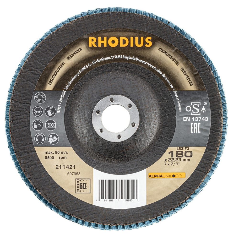 Ce disque a été conçu conformément à la norme EN 13743, satisfait aux exigences de sécurité et est homologué par l’oSA. Il est doté d’un plateau support en fibres de verre. Son utilisateur peut travailler en exerçant de fortes pressions sur sa machine. Le LSZ F3 utilise du zirconium de qualité comme grain abrasif. Tous les disques à lamelles RHODIUS ne contiennent en outre ni fer, ni soufre. Les lamelles sont placées de manière conique sur ce disque. Le positionnement conique des lamelles à 10° améliore l’ergonomie pendant le meulage et facilite ainsi la manipulation.
