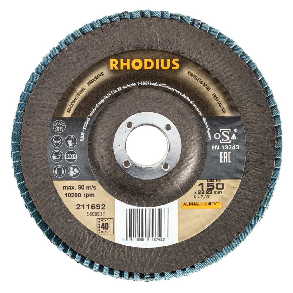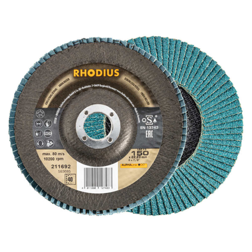 Ce disque a été conçu conformément à la norme EN 13743, satisfait aux exigences de sécurité et est homologué par l’oSA. Il est doté d’un plateau support en fibres de verre. Son utilisateur peut travailler en exerçant de fortes pressions sur sa machine. Le LSZ F3 utilise du zirconium de qualité comme grain abrasif. Tous les disques à lamelles RHODIUS ne contiennent en outre ni fer, ni soufre. Les lamelles sont placées de manière conique sur ce disque. Le positionnement conique des lamelles à 10° améliore l’ergonomie pendant le meulage et facilite ainsi la manipulation.