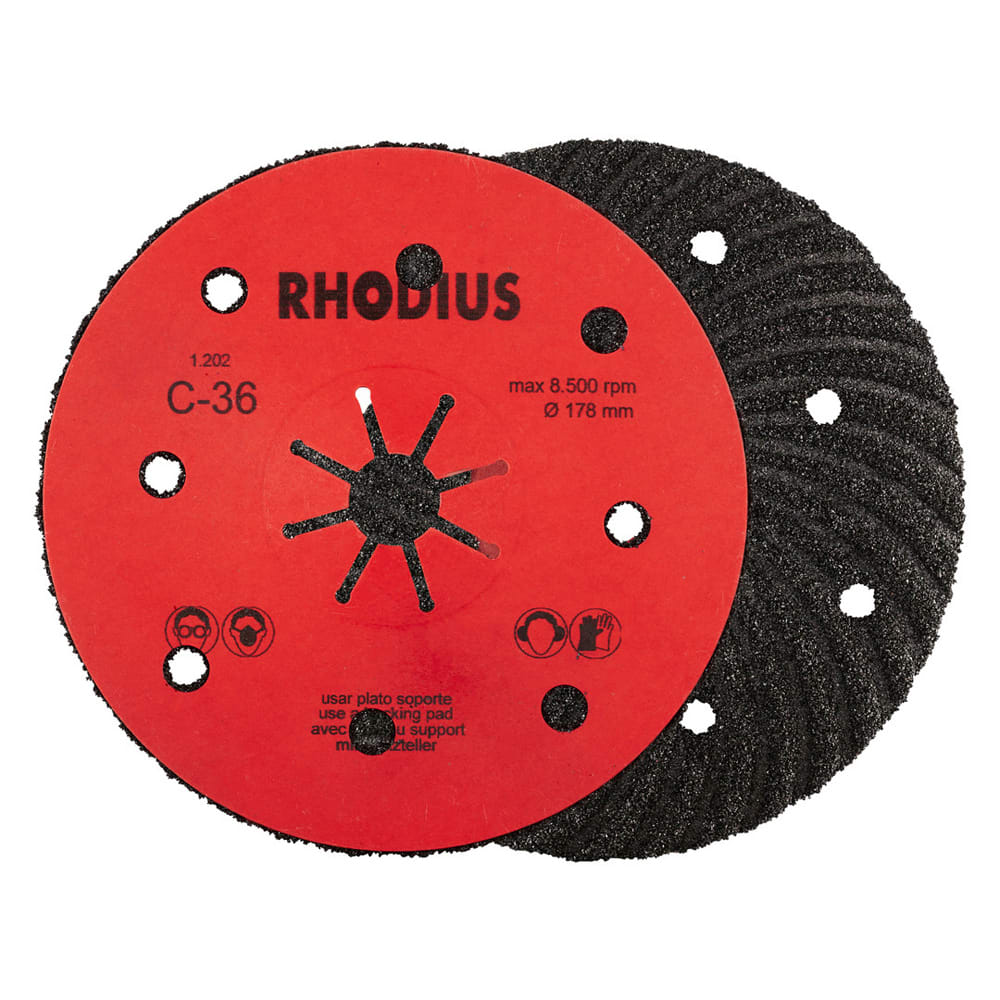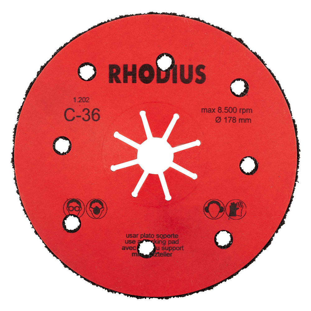 L’utilisation de ce disque fibre n’est autorisée qu’avec un plateau support adéquat, tel que le RHODIUS RH ST. Un plateau support d'un diamètre correspondant doit ici impérativement être choisi.