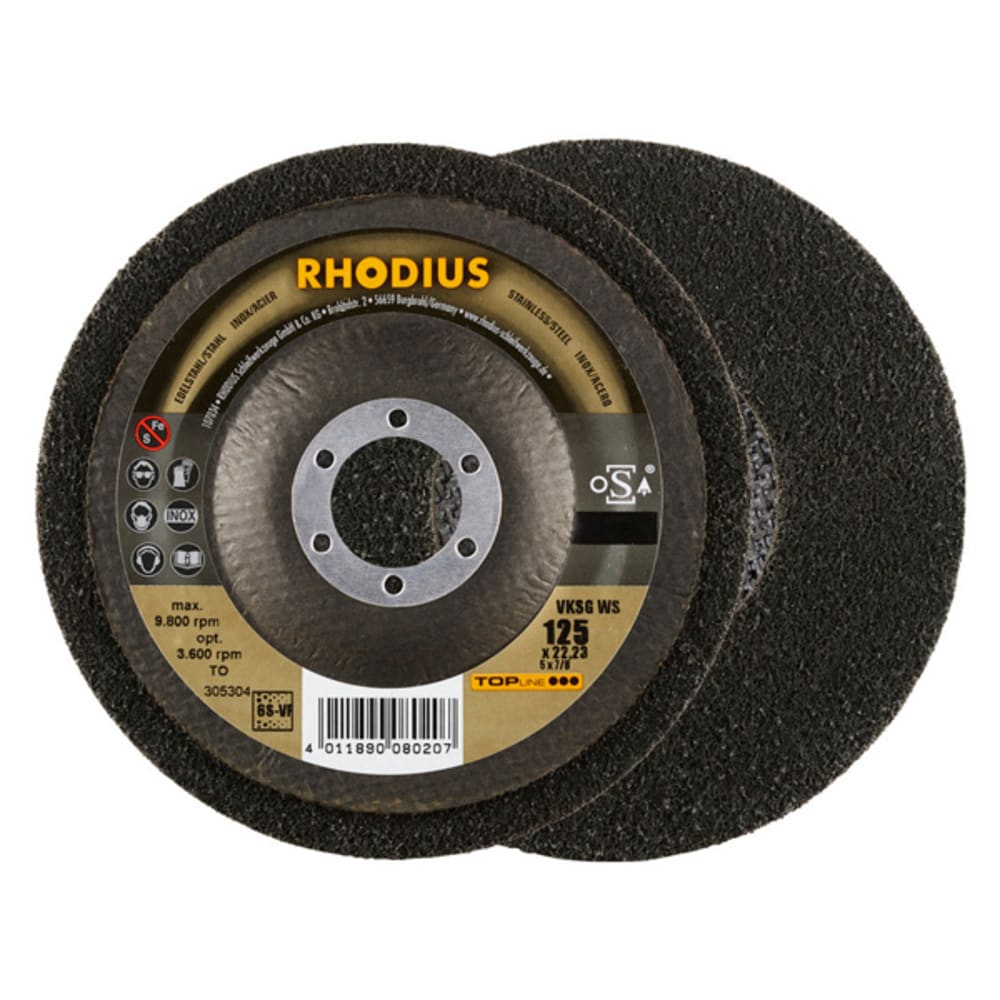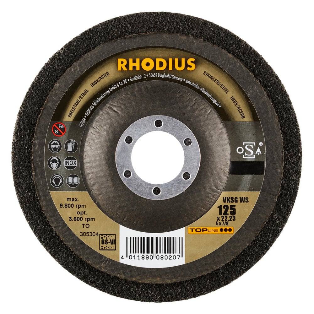 Celui-ci a été spécialement développé pour le traitement de l’acier inoxydable (acier VA, inox), p. ex. 1.4301 (X5CrNi18-10 ou 304), ainsi que de l’acier (acier au carbone, également appelé acier de construction, St37, S235JR, 1.0037 ou acier noir) et de la fonte d’acier, mais aussi de l’aluminium et d’autres métaux non-ferreux, tels que le cuivre, le laiton, le bronze, etc. Avec le VKSG WS de RHODIUS, l’utilisateur obtiendra de très bons résultats sur tous les matériaux indiqués ici.