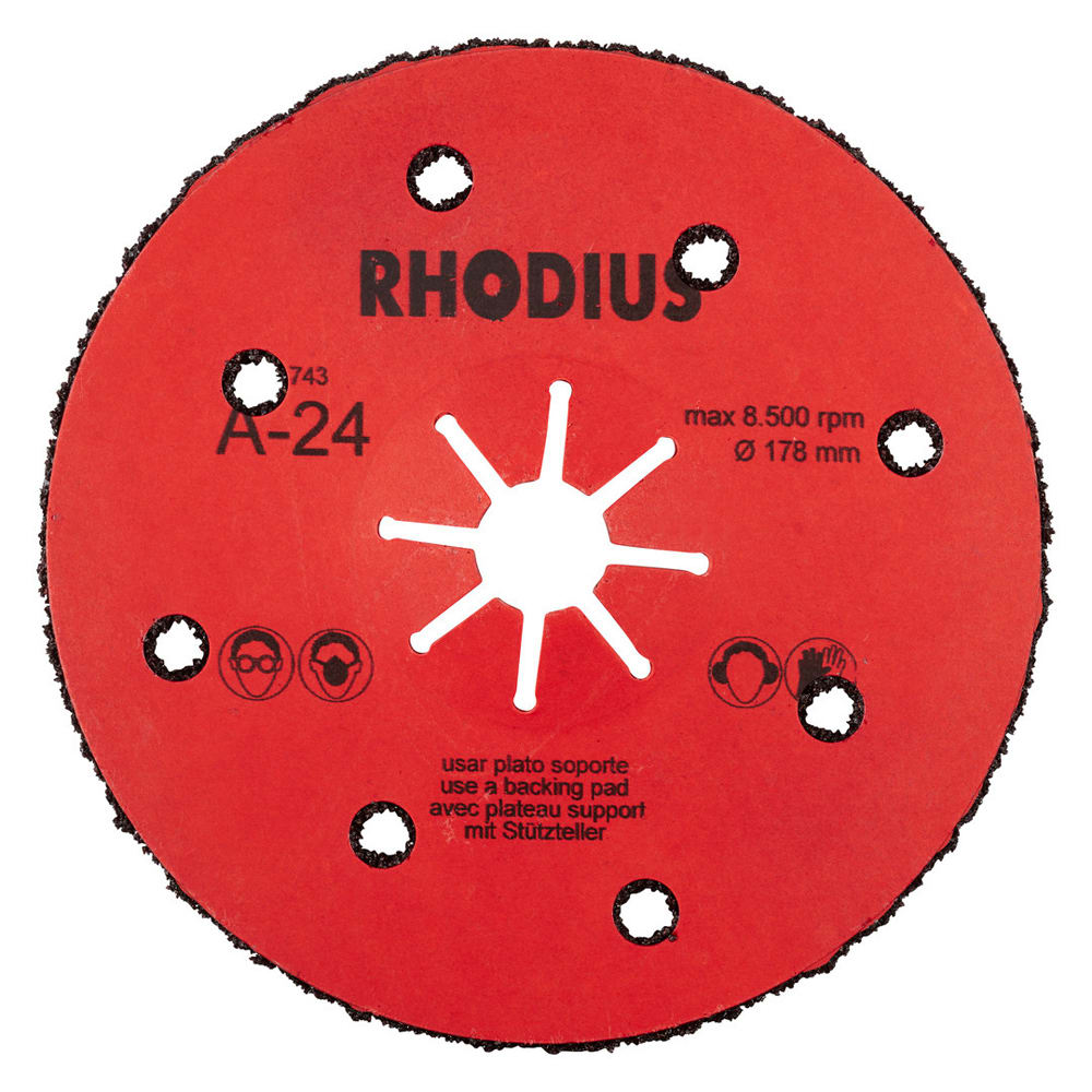 L’utilisation de ce disque fibre n’est autorisée qu’avec un plateau support adéquat, tel que le RHODIUS RH ST. Un plateau support d'un diamètre correspondant doit ici impérativement être choisi.