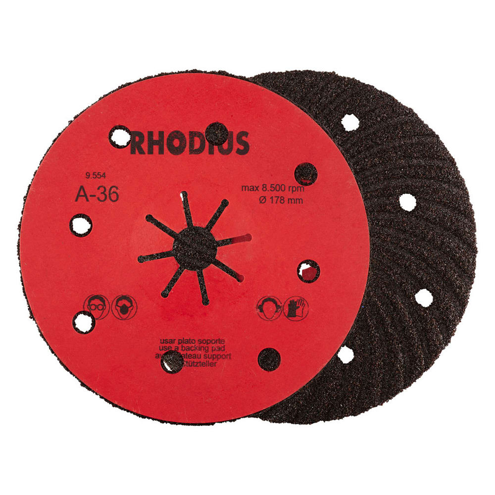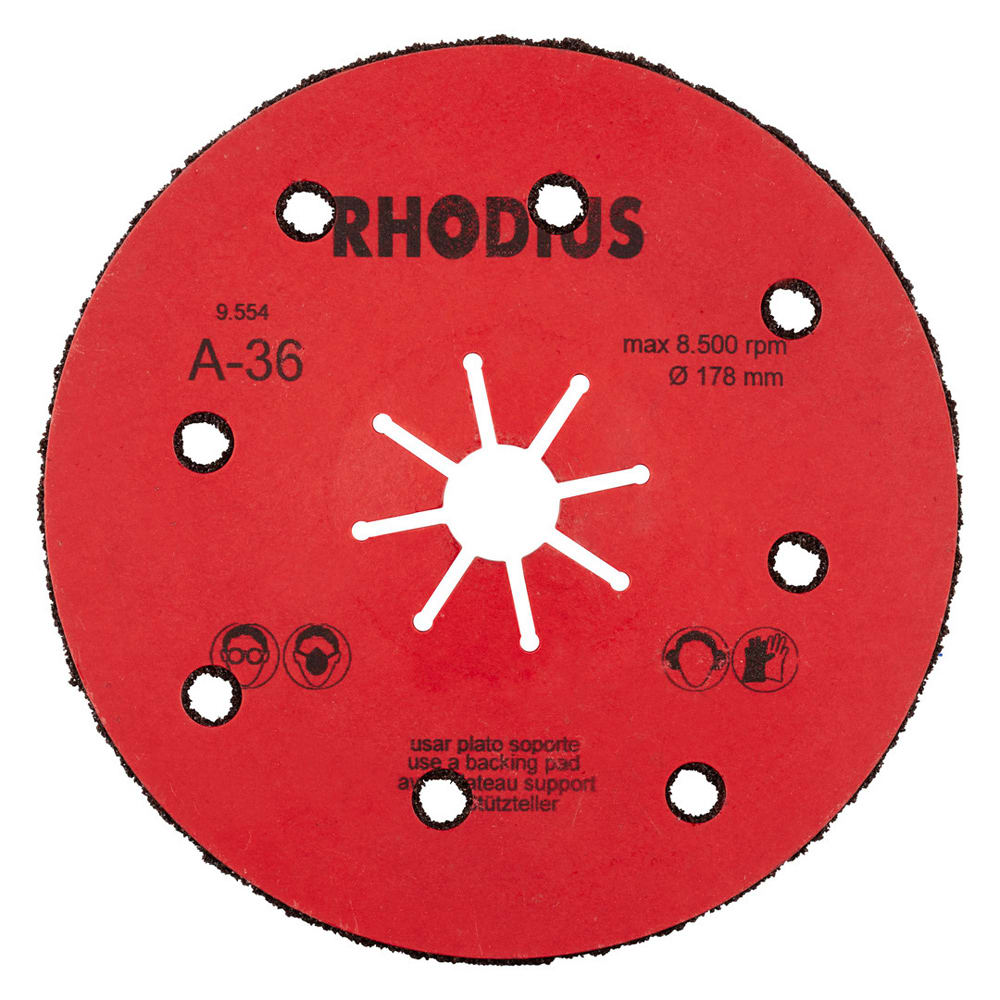 L’utilisation de ce disque fibre n’est autorisée qu’avec un plateau support adéquat, tel que le RHODIUS RH ST. Un plateau support d'un diamètre correspondant doit ici impérativement être choisi.