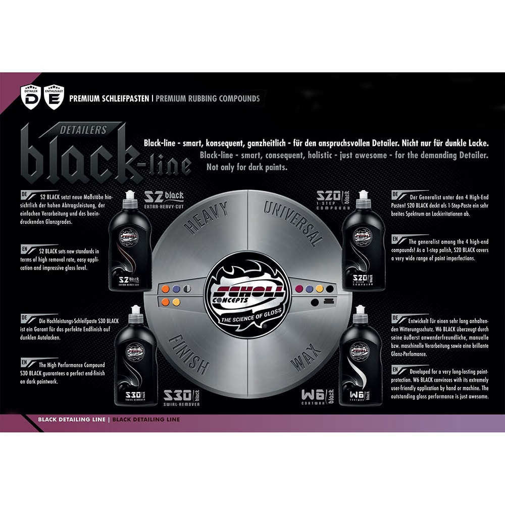 S2 BLACK, l'extraordinaire polish coupant de haute performance, a été spécialement développé pour le détailer. Un polish unique développé pour les surfaces de peinture extrêmement rayées et altérées. S2 BLACK élimine les irrégularités de la peinture en quelques secondes, laissant une finition impeccable sans aucune contamination par la poussière. Élimine les traces de rayure de grain P1200 - P1500 en quelques secondes. Enorme capacité d'enlèvement avec un minimum de poussière. Excellentes propriétés de brillance. Exempt de COV. Nettoyage facile "easy clean. Traitement avec toutes les machines de polissage courantes (rotatives & excentriques).