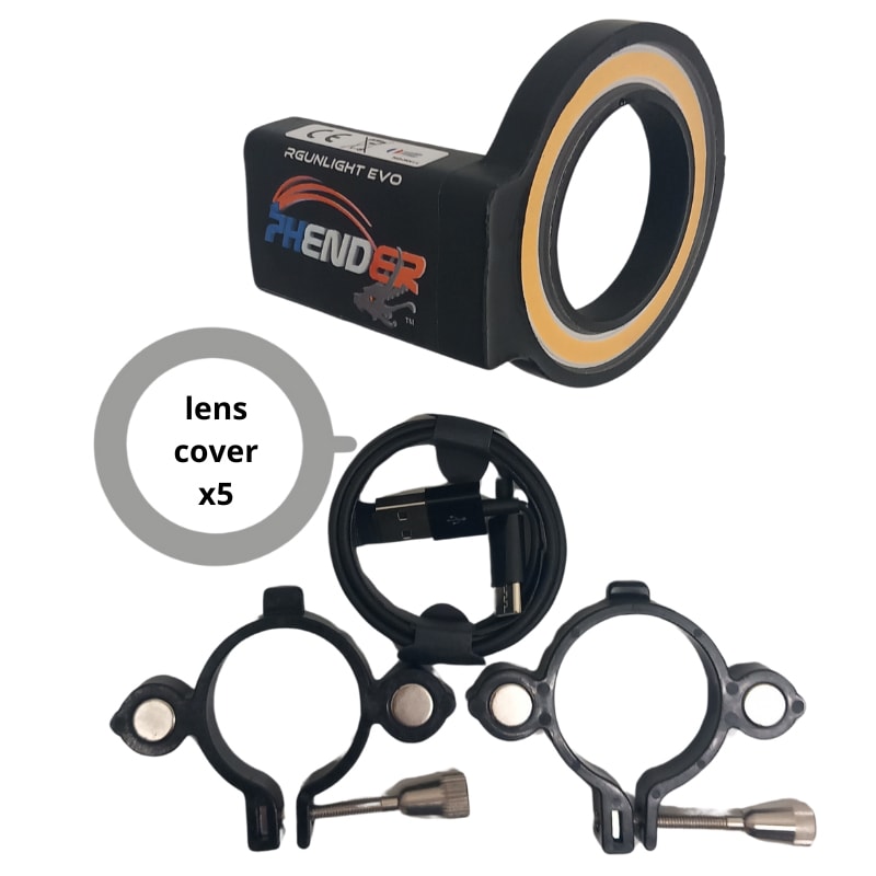 Rgunlight Evo + 2x supports (34-38 mm & 38-44 mm), 5x lens cover, 1x cab.