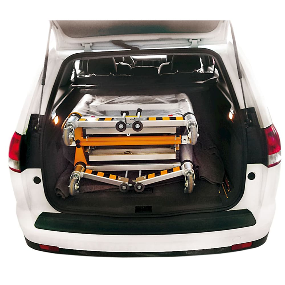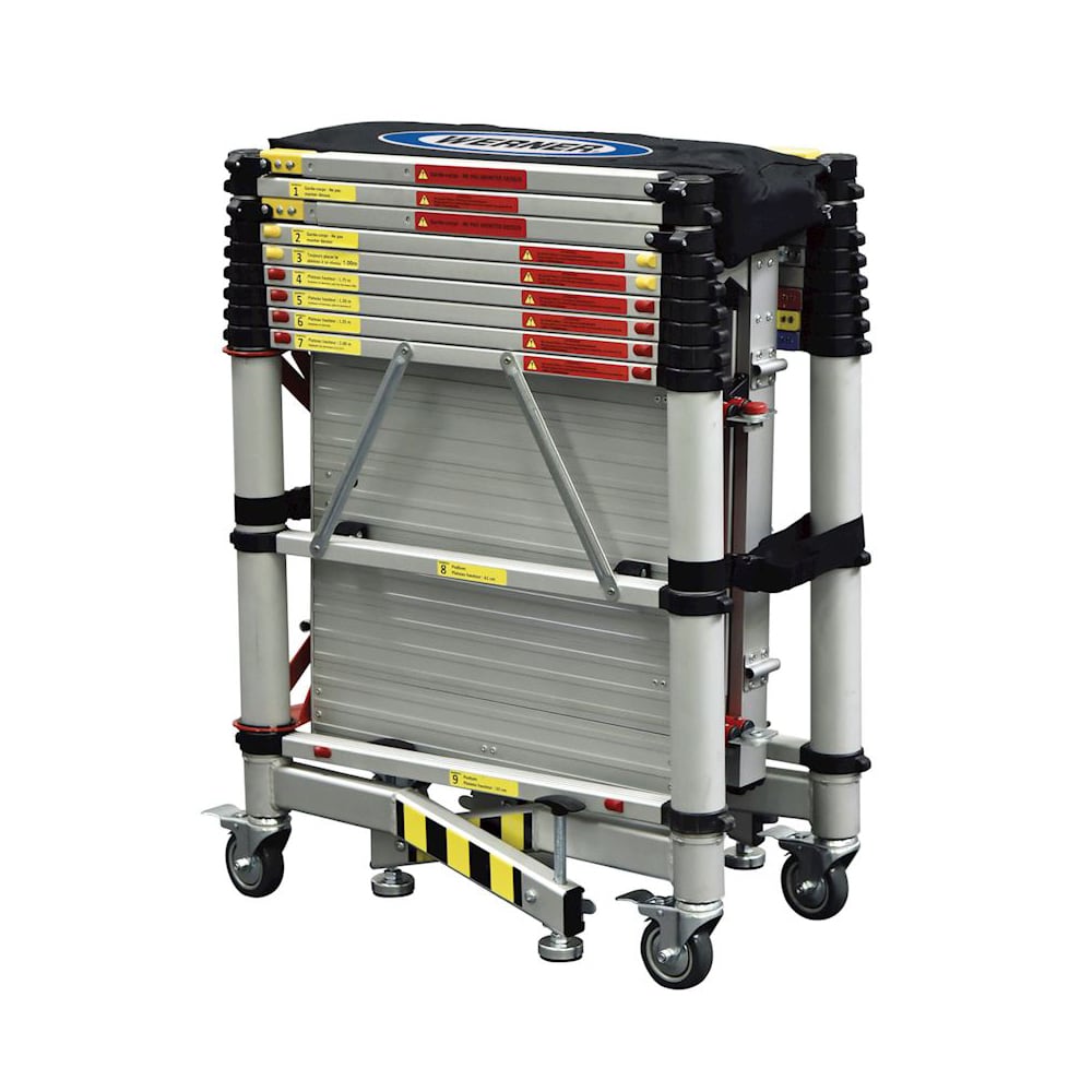 Le premier échafaudage pliable et télescopique! 5 hauteurs de 1 à 2m (hauteur de travail 3-4m). Plate-forme 70 x 140cm avec lucarne. Monté par une seule personne en 3 minutes. Roues blocables. Peut être transporté dans une voiture, composé de seulement 2 pièces. Chargeable jusqu'à 150 kg (sur la plate-forme), conforme à EN 1004.